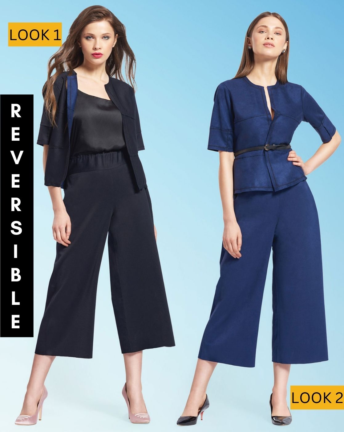 Suede exudes formality and class, but this co-ord set takes it up a notch by offering reversible options in black and blue. With the freedom to flip and wear any combination you desire, the possibilities are endless!