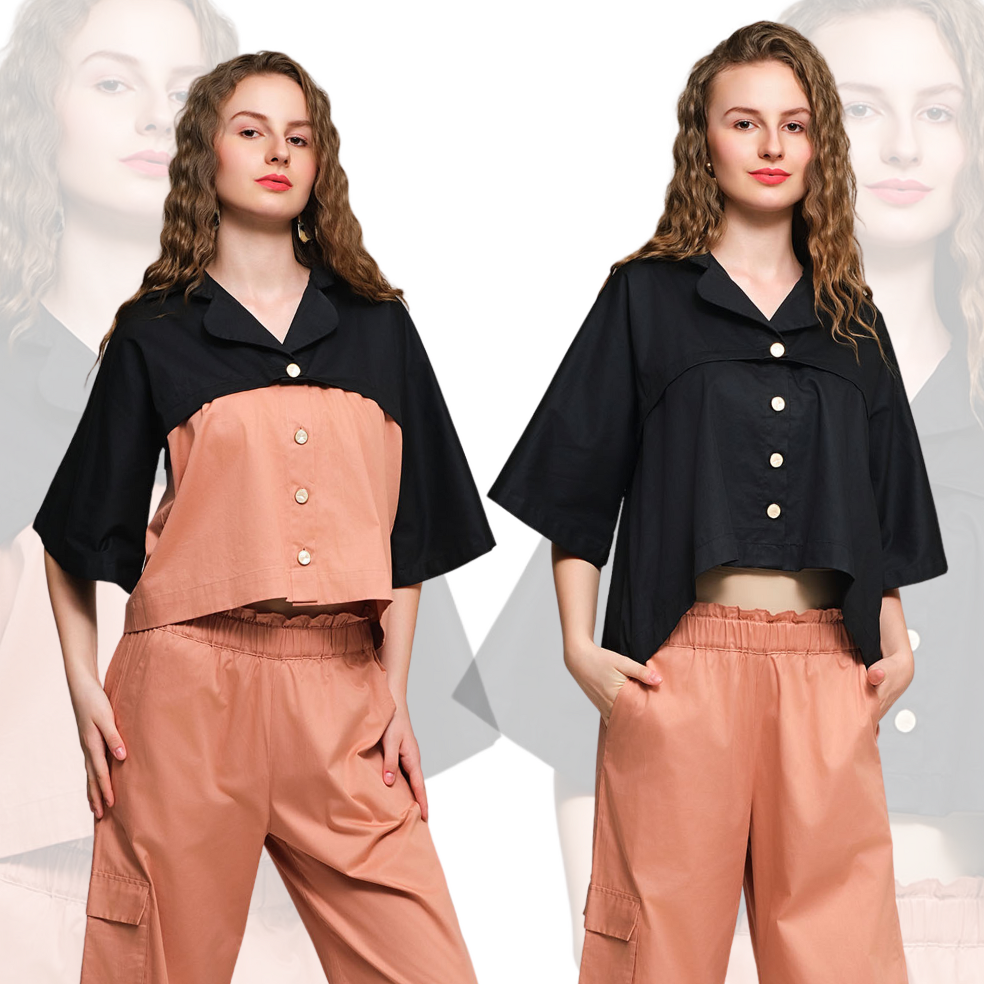 Pack light and versatile with this Convertible Shirt that transforms instantly—wear it plain for a relaxed look or add the panel for a color-blocked, fashion-forward vibe.