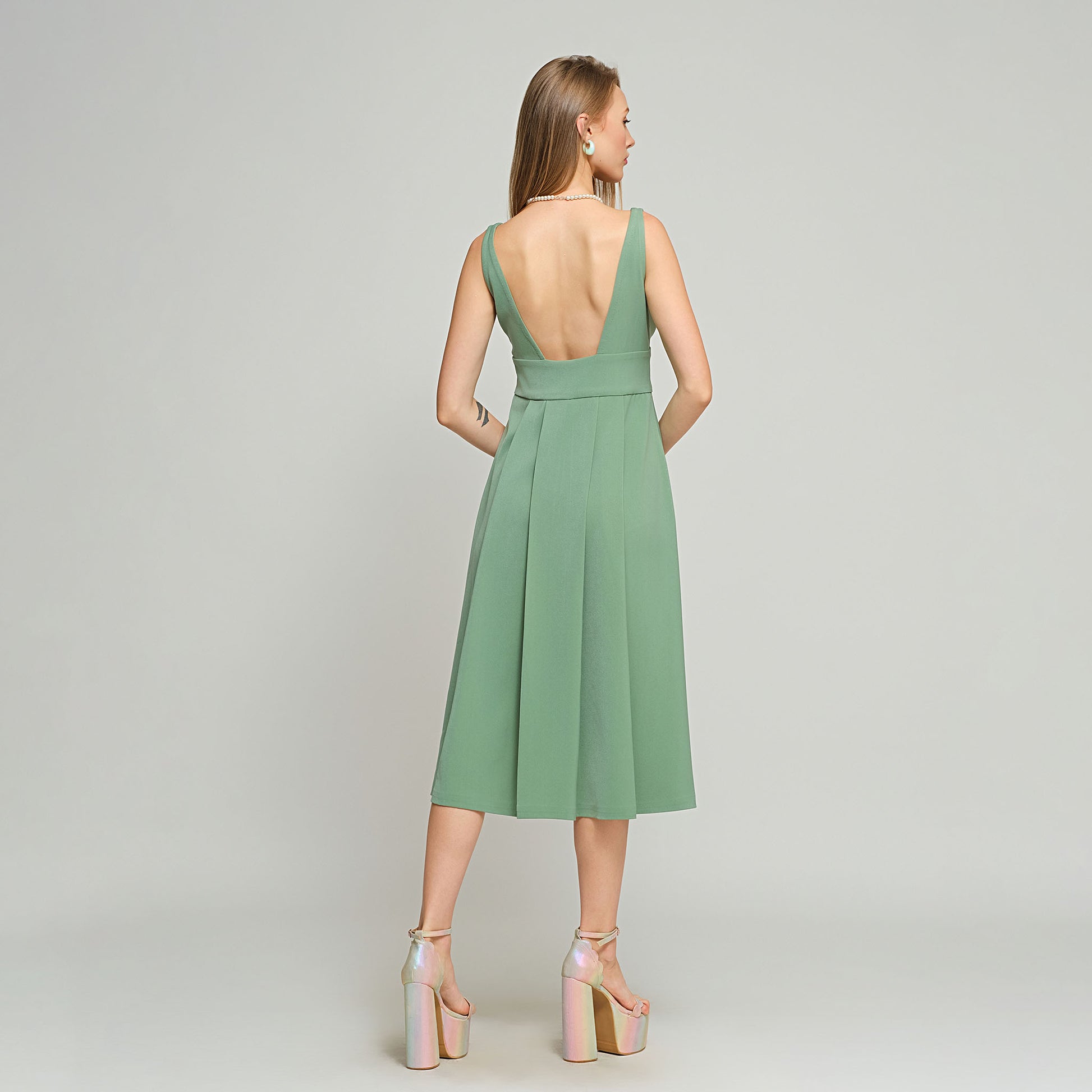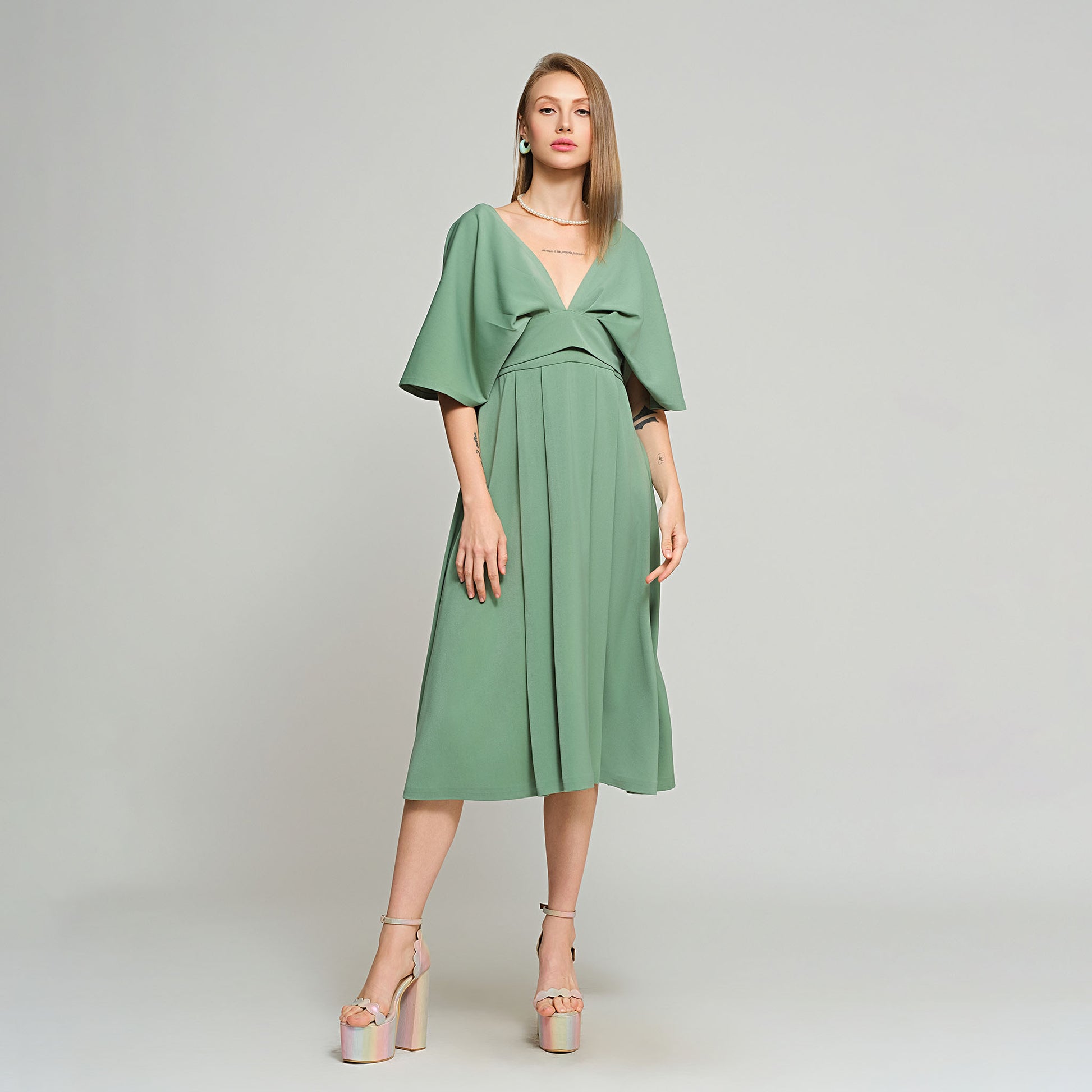 Look 2 - Sleeveless dress with a solid color detachable cape