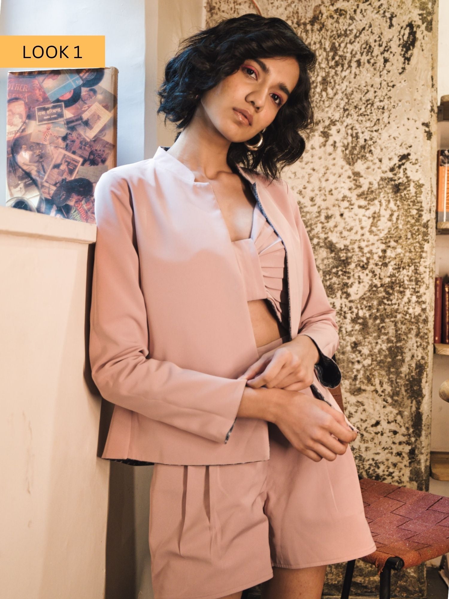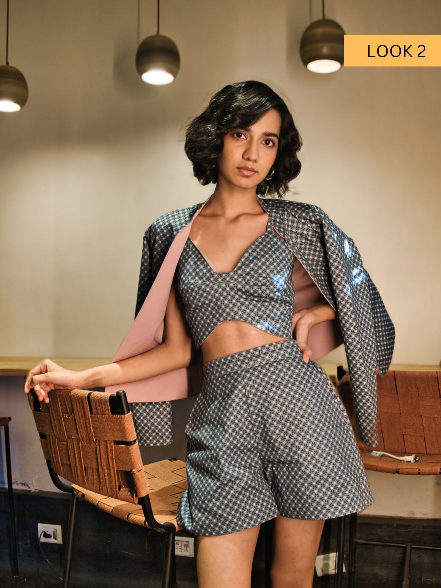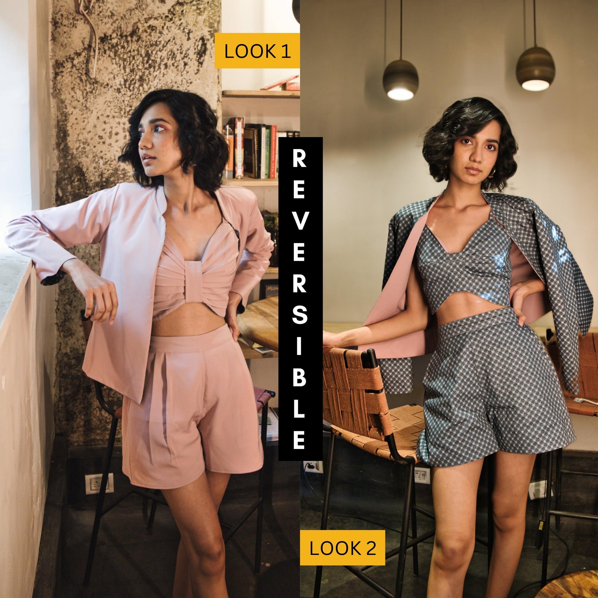 Elevate your style effortlessly for any occasion with our flawless 3-piece co-ord set featuring a reversible bralette, reversible jacket, and reversible shorts.