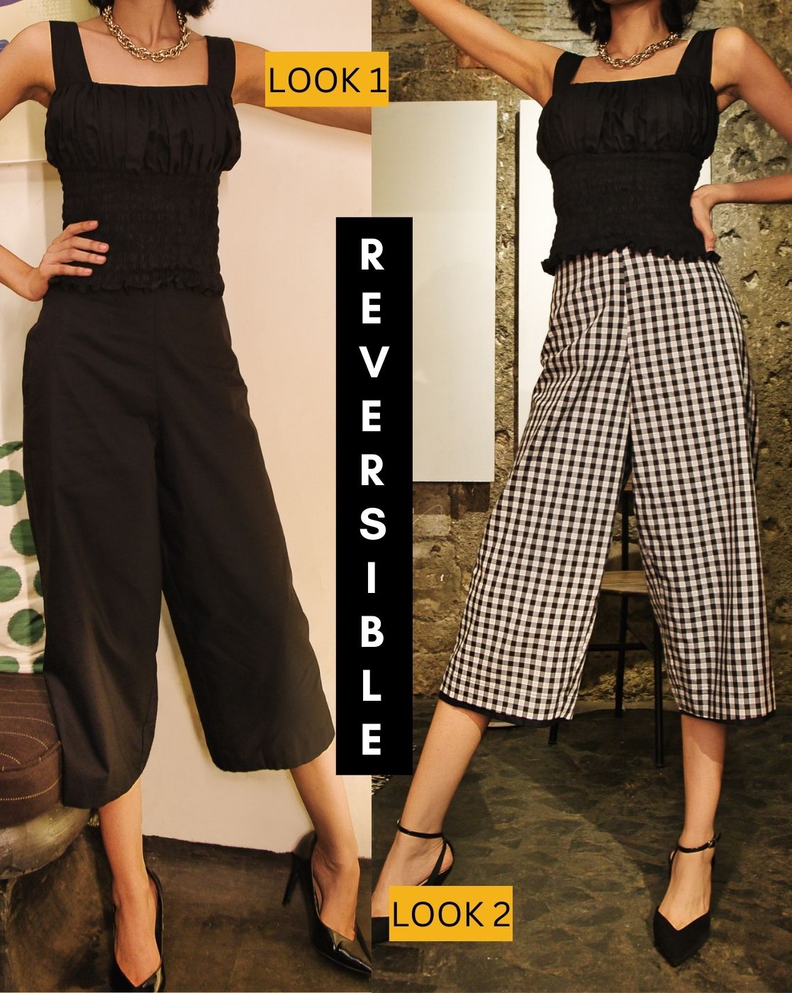 Transform your style effortlessly! Flip for a sleek all-black formal look or a playful black and white checkered design. Versatility meets elegance in one chic pair of pants. Upgrade your wardrobe now!