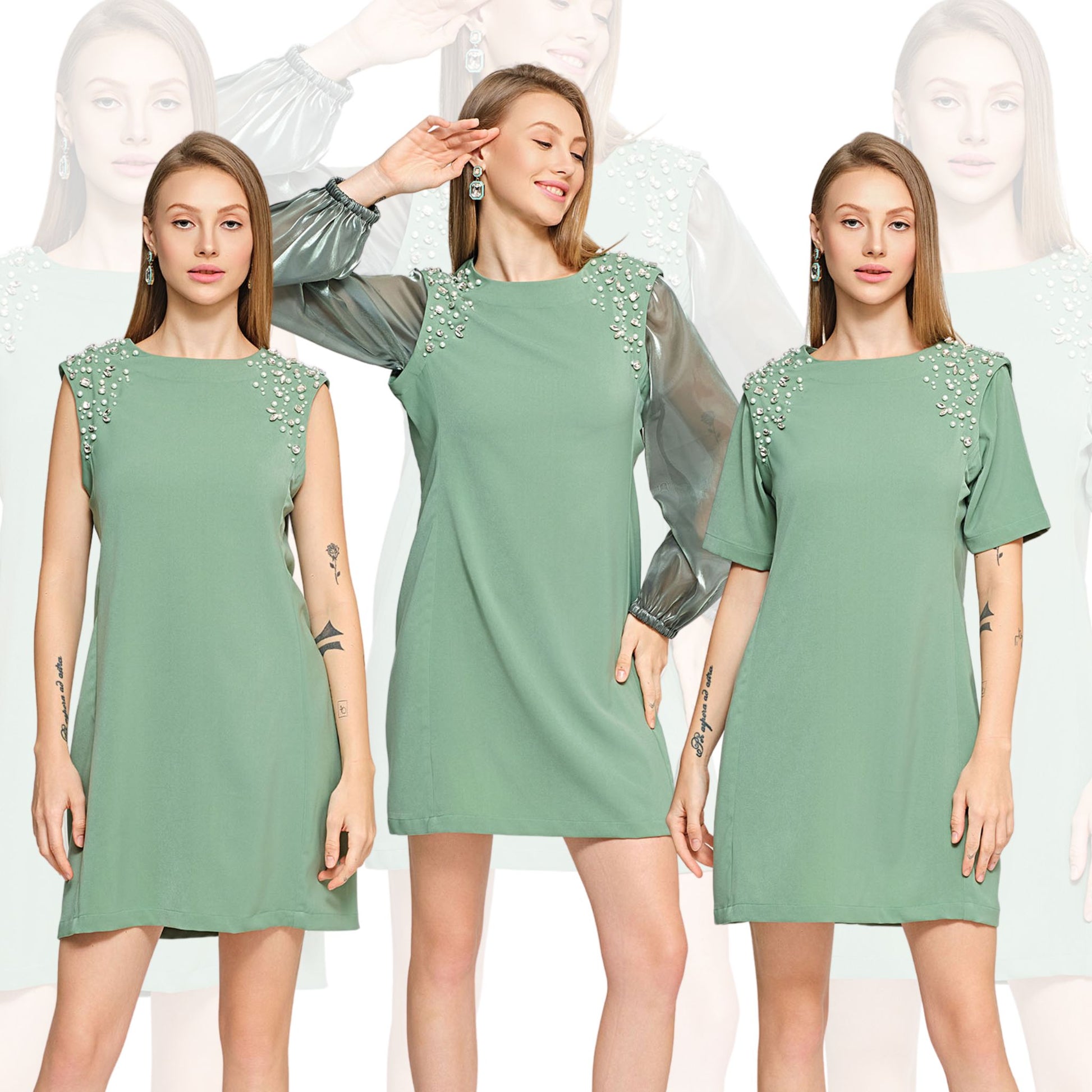 Elevate your wardrobe with our Classic Shift Dress, a perfect blend of style and adaptability. Wear it sleeveless for a sleek, modern vibe, attach the half sleeves for a polished, formal look, or add the full organza sleeves to create an elegant, statement-making outfit for special occasions. Designed to suit everything from casual outings to sophisticated events, this convertible shift dress is a timeless addition to your collection. Shop now and experience effortless versatility in one stunning piece!